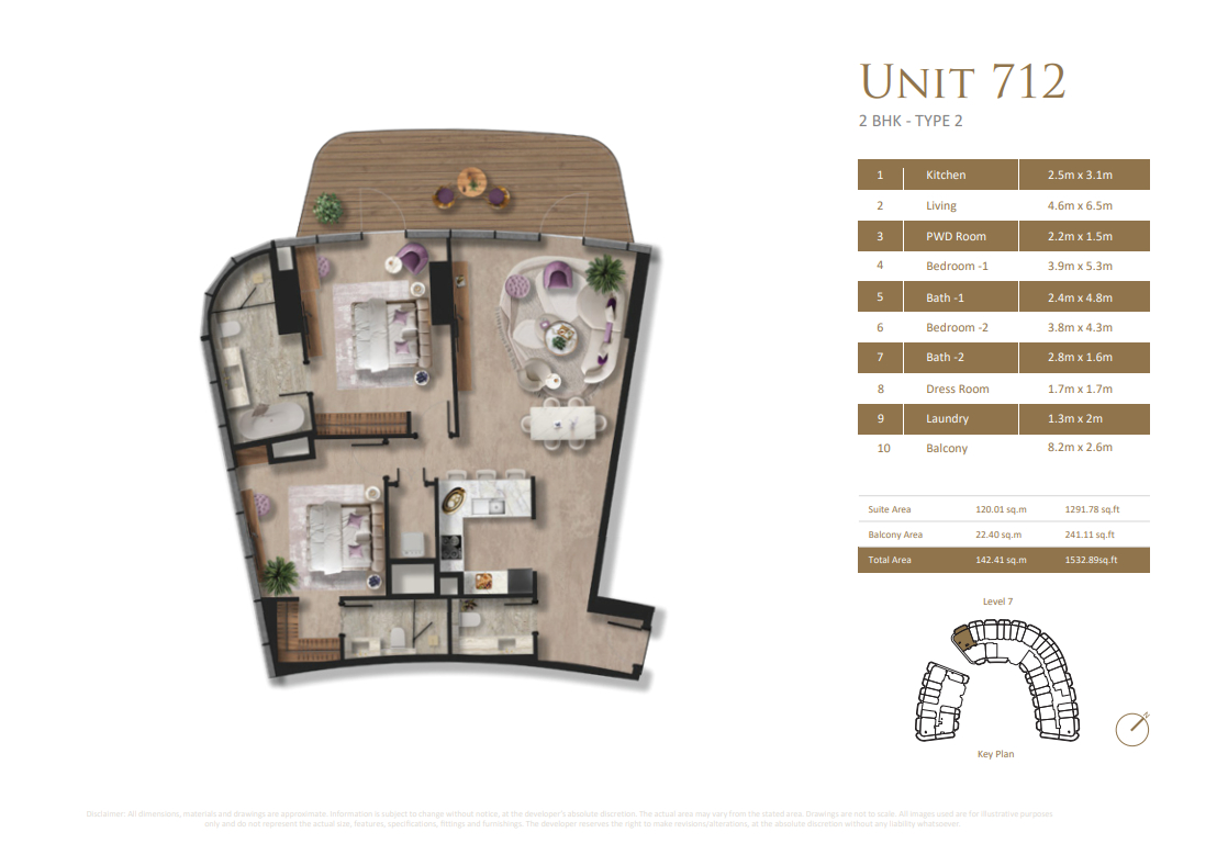 Taj Wellington Mews features two interconnected towers positioned atop a landscaped podium, forming a striking presence along the Al Marjan Island coastline. The architectural design emphasises soft curves, recessed balconies, and expansive glazing — combining modern form with functionality. Every home benefits from natural light, cross-ventilation, and sea-facing orientation.